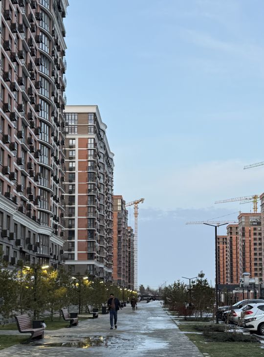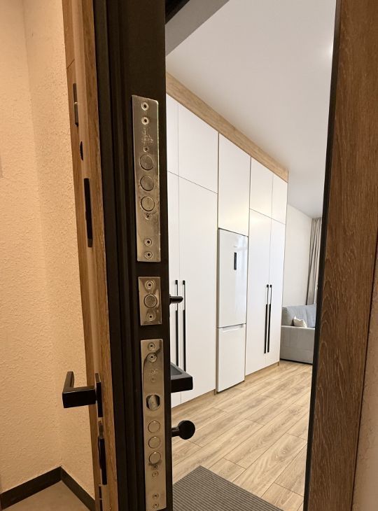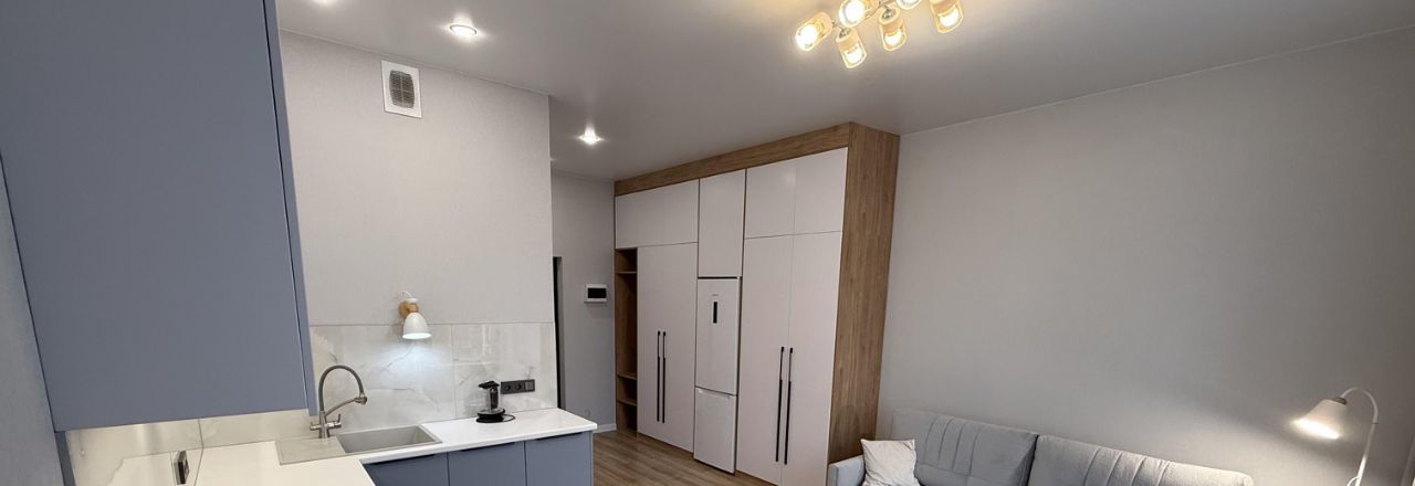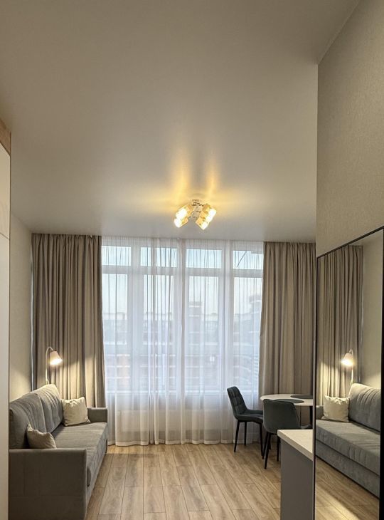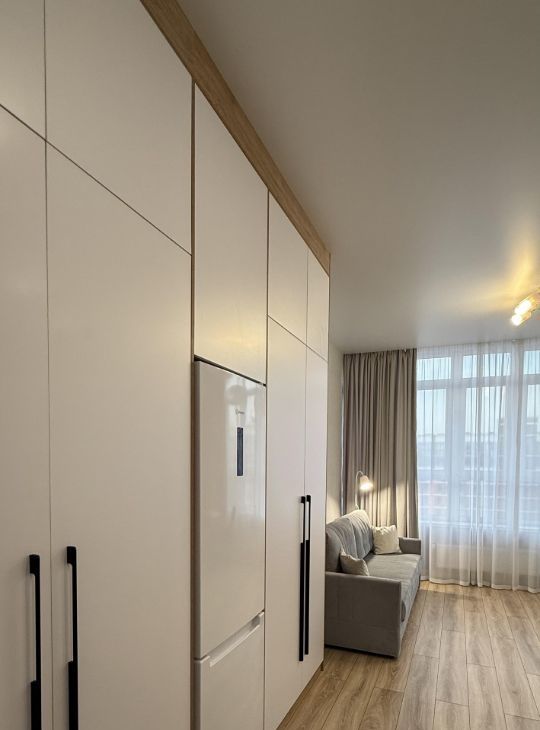 Сдаётся уютная студия с современным евроремонтом в новом доме, построенном в 2024 году. Квартира расположена на 15-м этаже 16-этажного дома и имеет площадь 27.4 кв. м, из которых жилая зона занимает 10 кв. м, а кухня — 9 кв. м. Высокие потолки (3 метра) и витражные окна во всю стену создают ощущение простора. Из окон открывается вид на будущее озеро.