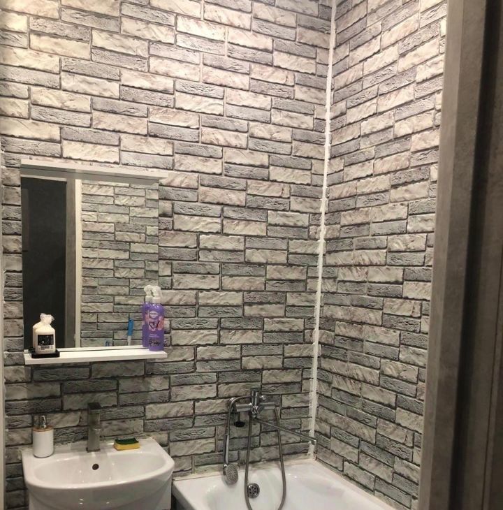 Ванная комната совмещенная, оформлена в современном стиле с использованием декоративной плитки. Из мебели — удобный диван и вместительный шкаф.