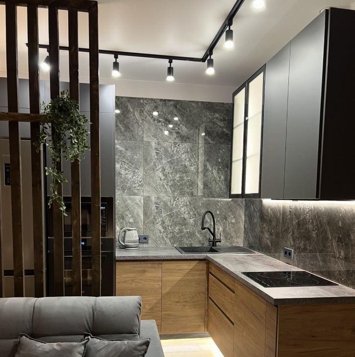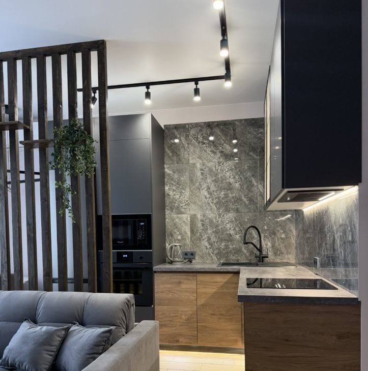 кухонный гарнитур со встроенной техникой , две зоны отдыха с раскладывающимися диванами .