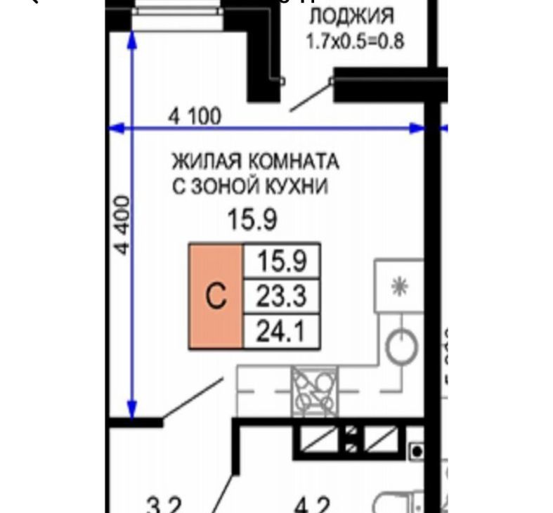 Жилая с зоной кухни 15,9 кв.м.