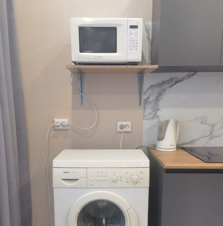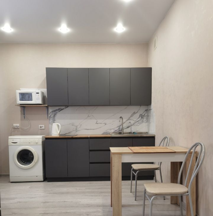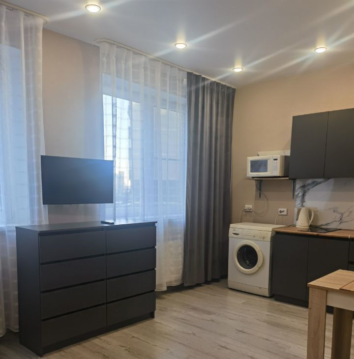 В квартире сделан качественный евроремонт, что создаёт атмосферу уюта и комфорта. Студия полностью меблирована: удобная мебель в комнате и на кухне. Из техники есть всё необходимое для комфортной жизни: кондиционер, холодильник, телевизор и стиральная машина. В ванной комнате установлена ванна, что позволит расслабиться после рабочего дня.