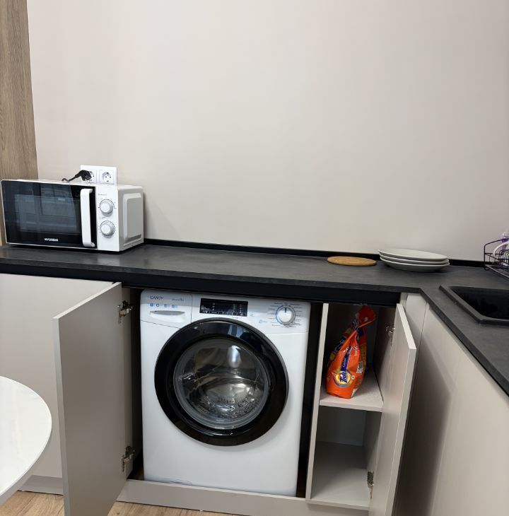 Есть все необходимое: встроенная кухня,большой шкаф, бытовая техника , посуда.