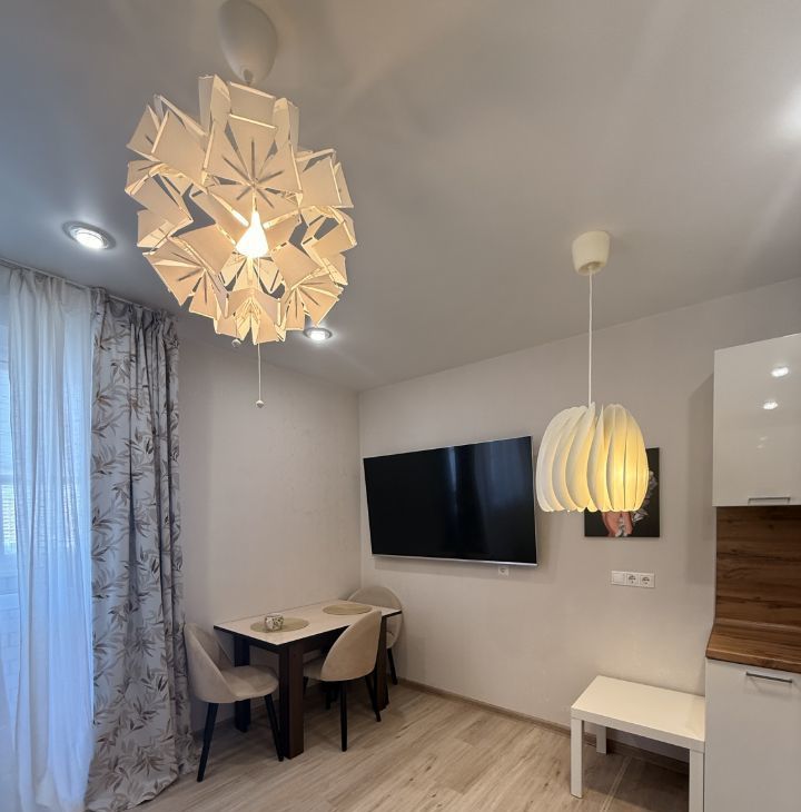 Кухня оборудована всем необходимым: холодильник, варочная панель, духовой шкаф, вытяжка, также в квартире имеется большой телевизор с подсветкой Ambilight, кондиционер и стиральная машина.
