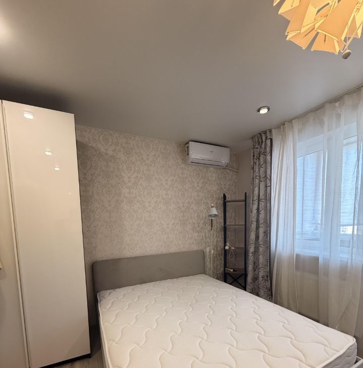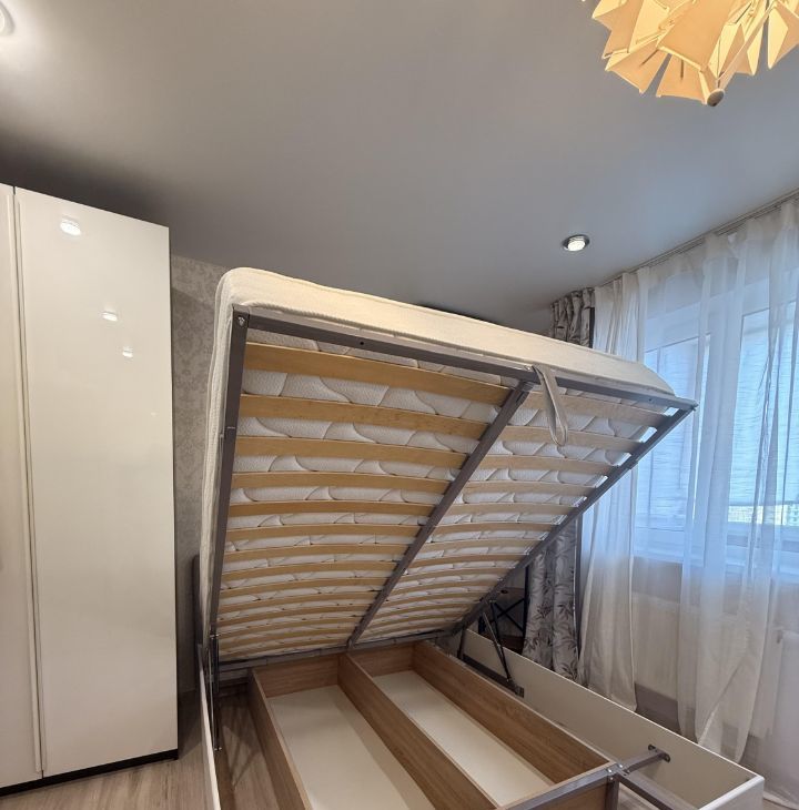 В комнате установлена современная двуспальная кровать + матрас фирмы Askona и вместительный шкаф для хранения вещей.
